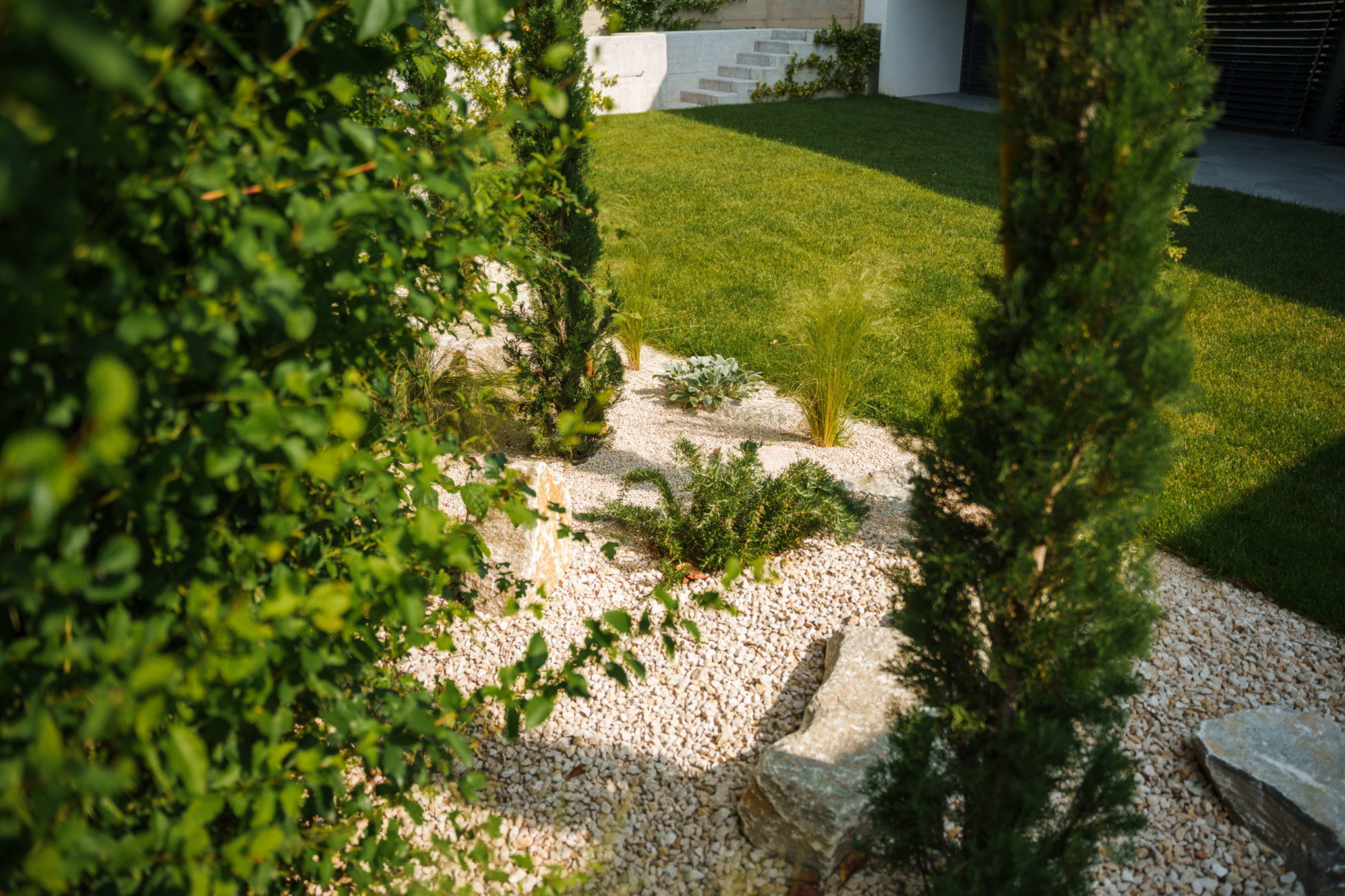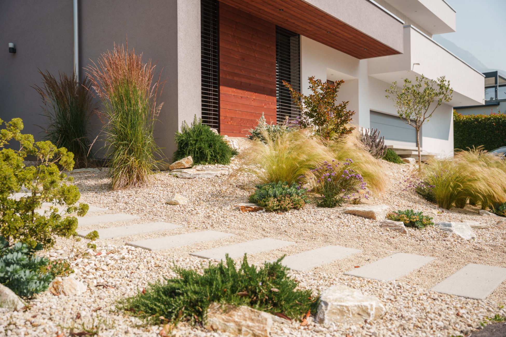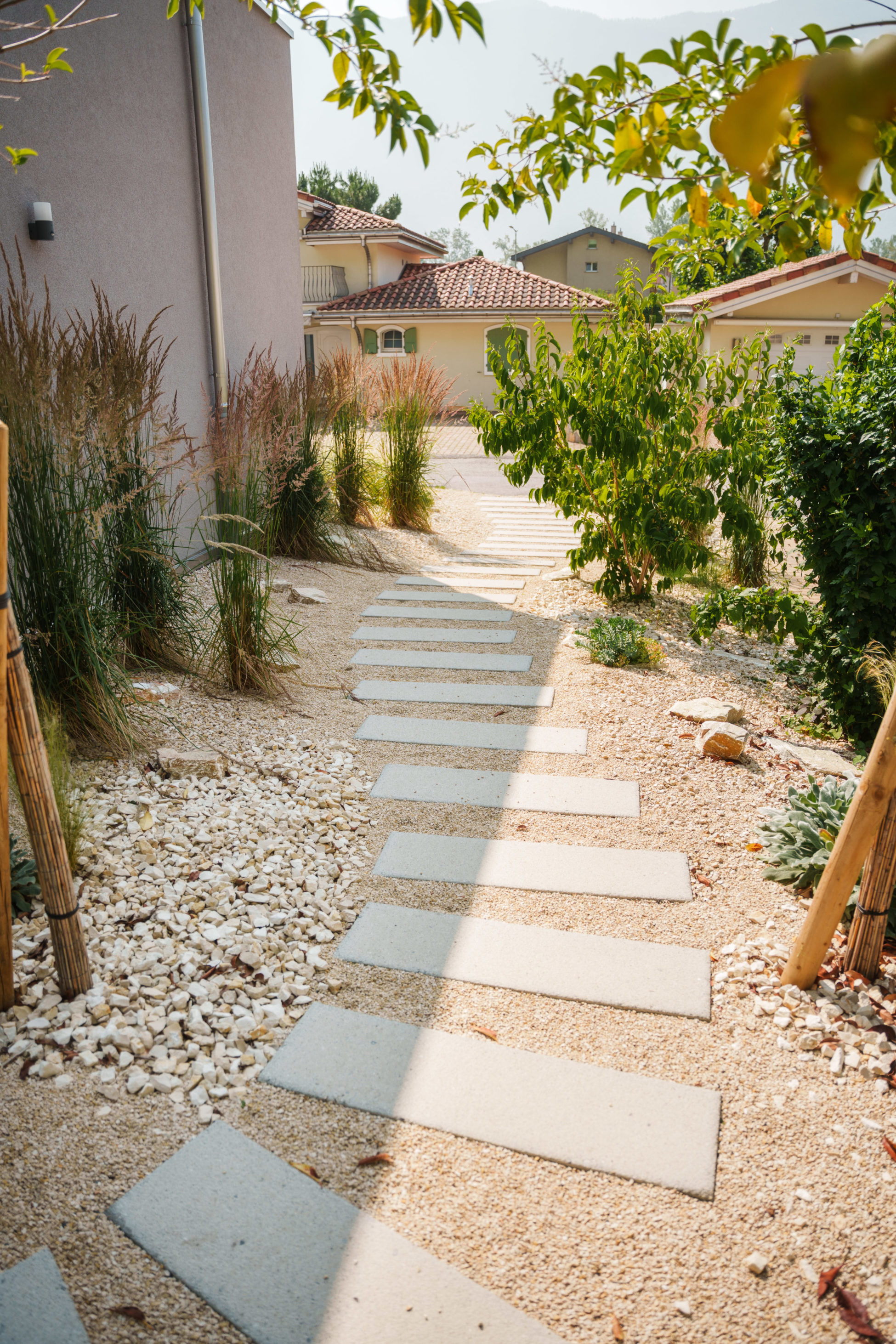Pour ce projet, nous avons conçu l'ensemble des extérieurs dans un esprit méditerranéen. L'entrée principale a été réalisé avec des marches d’escalier en béton préfabriquées. En collaboration avec l’un de nos partenaires, le parking a été agencé en pavés naturels. Nous avons aménagé un gravel garden aux inspirations méditerranéennes pour apporter une touche graphique et contemporaine, tout en limitant l’entretien. Un type de végétalisation pensé pour évoluer dans le temps, selon l'envie du client.