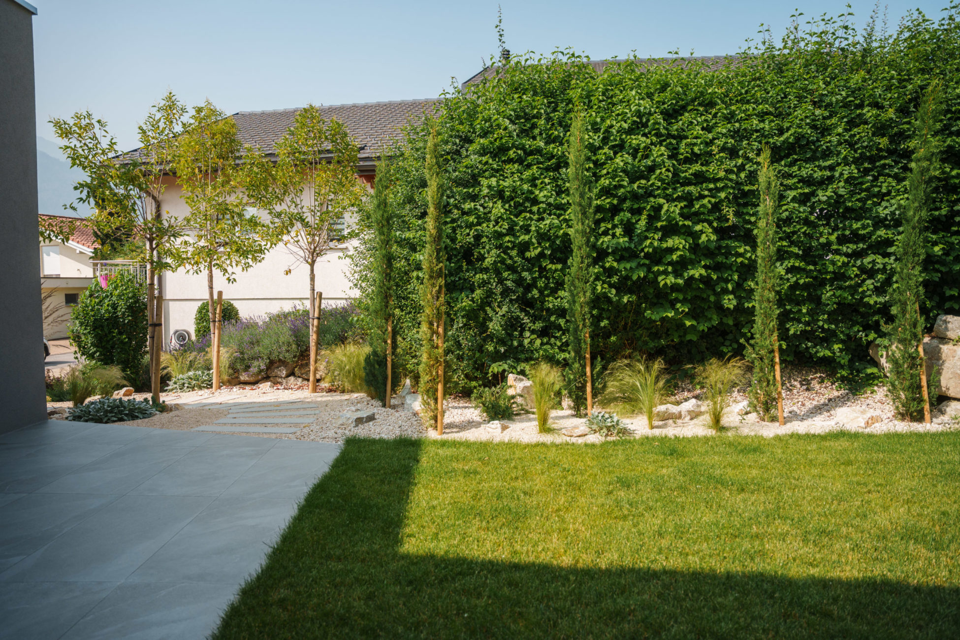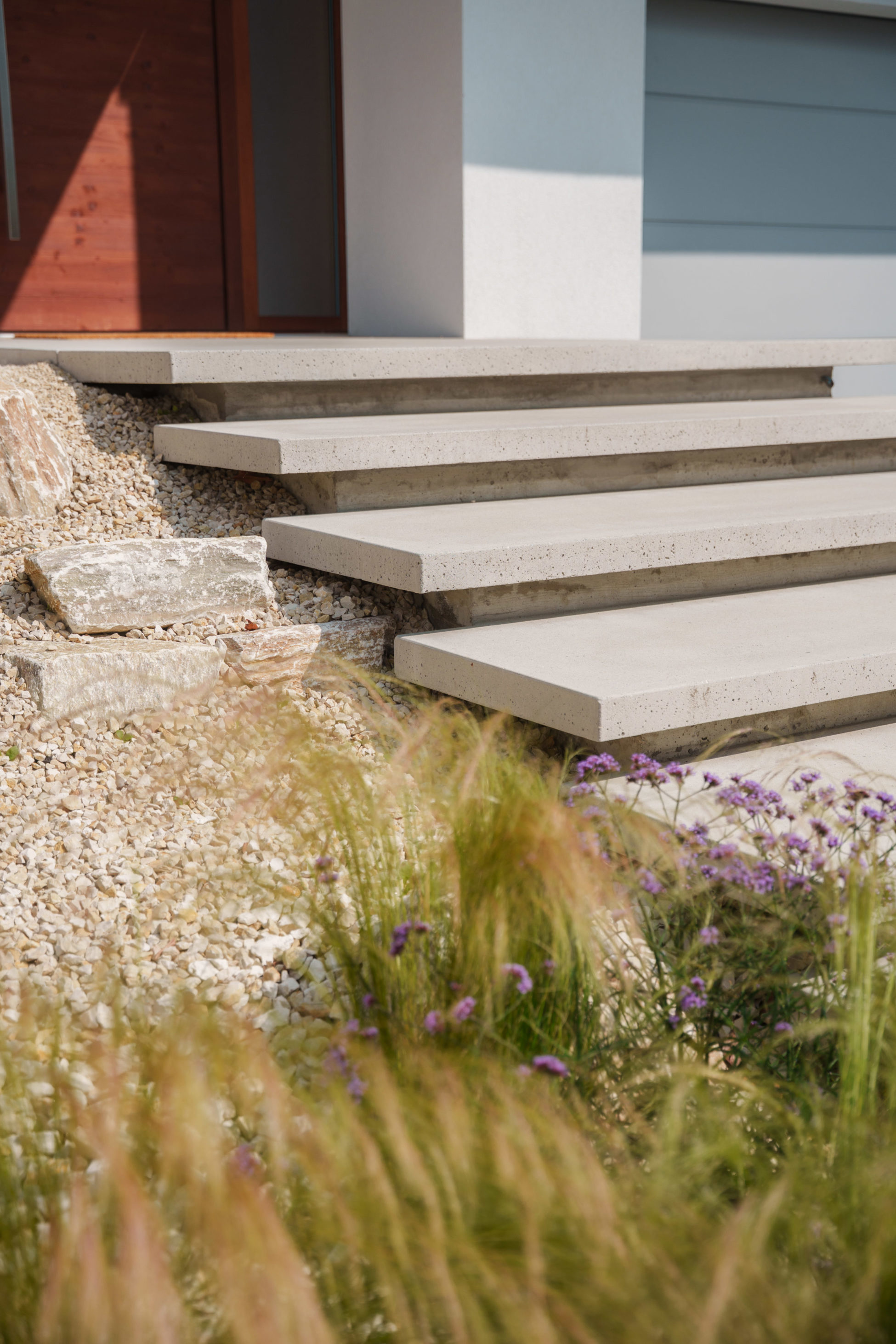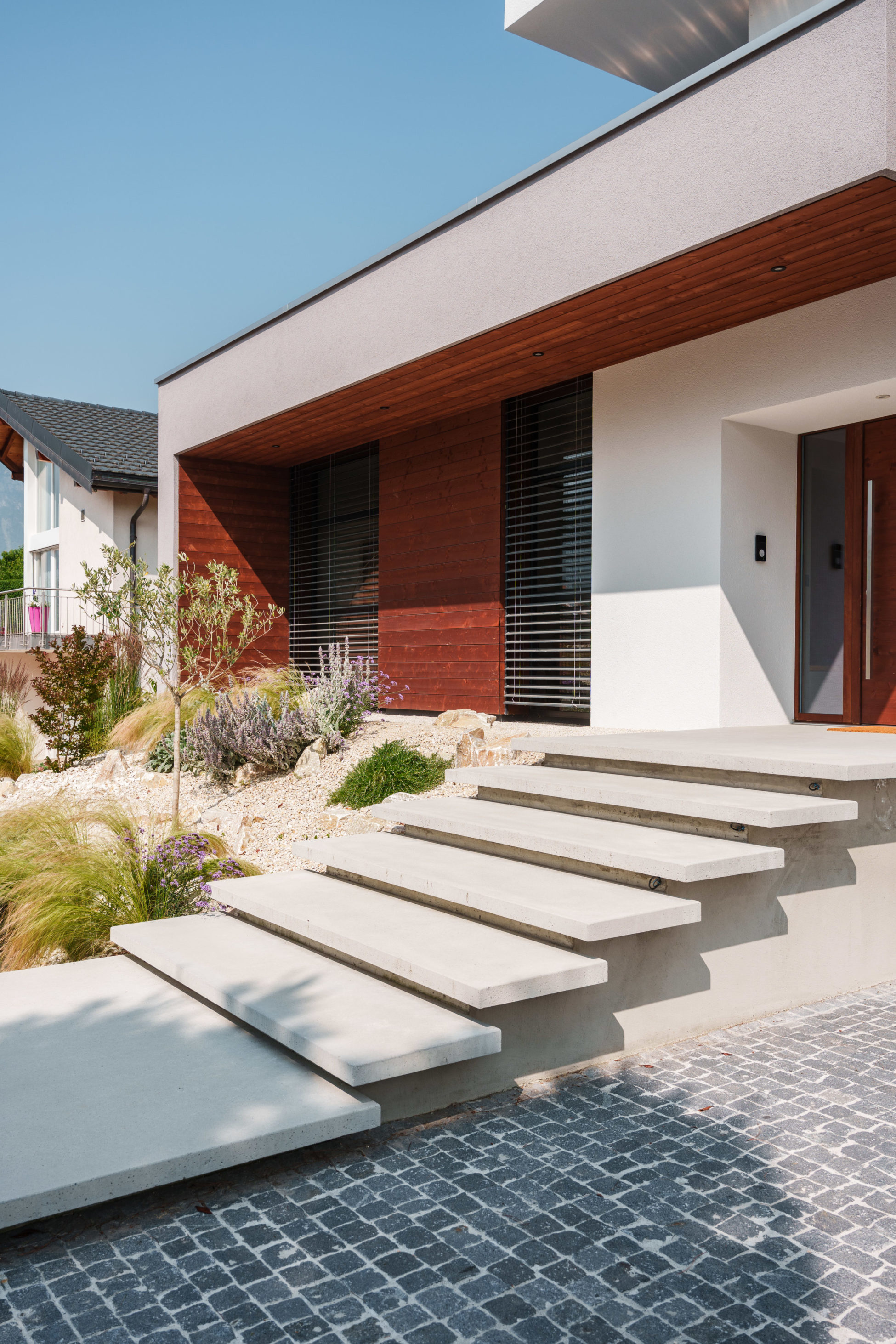 Pour ce projet, nous avons conçu l'ensemble des extérieurs dans un esprit méditerranéen. L'entrée principale a été réalisé avec des marches d’escalier en béton préfabriquées. En collaboration avec l’un de nos partenaires, le parking a été agencé en pavés naturels. Nous avons aménagé un gravel garden aux inspirations méditerranéennes pour apporter une touche graphique et contemporaine, tout en limitant l’entretien. Un type de végétalisation pensé pour évoluer dans le temps, selon l'envie du client.