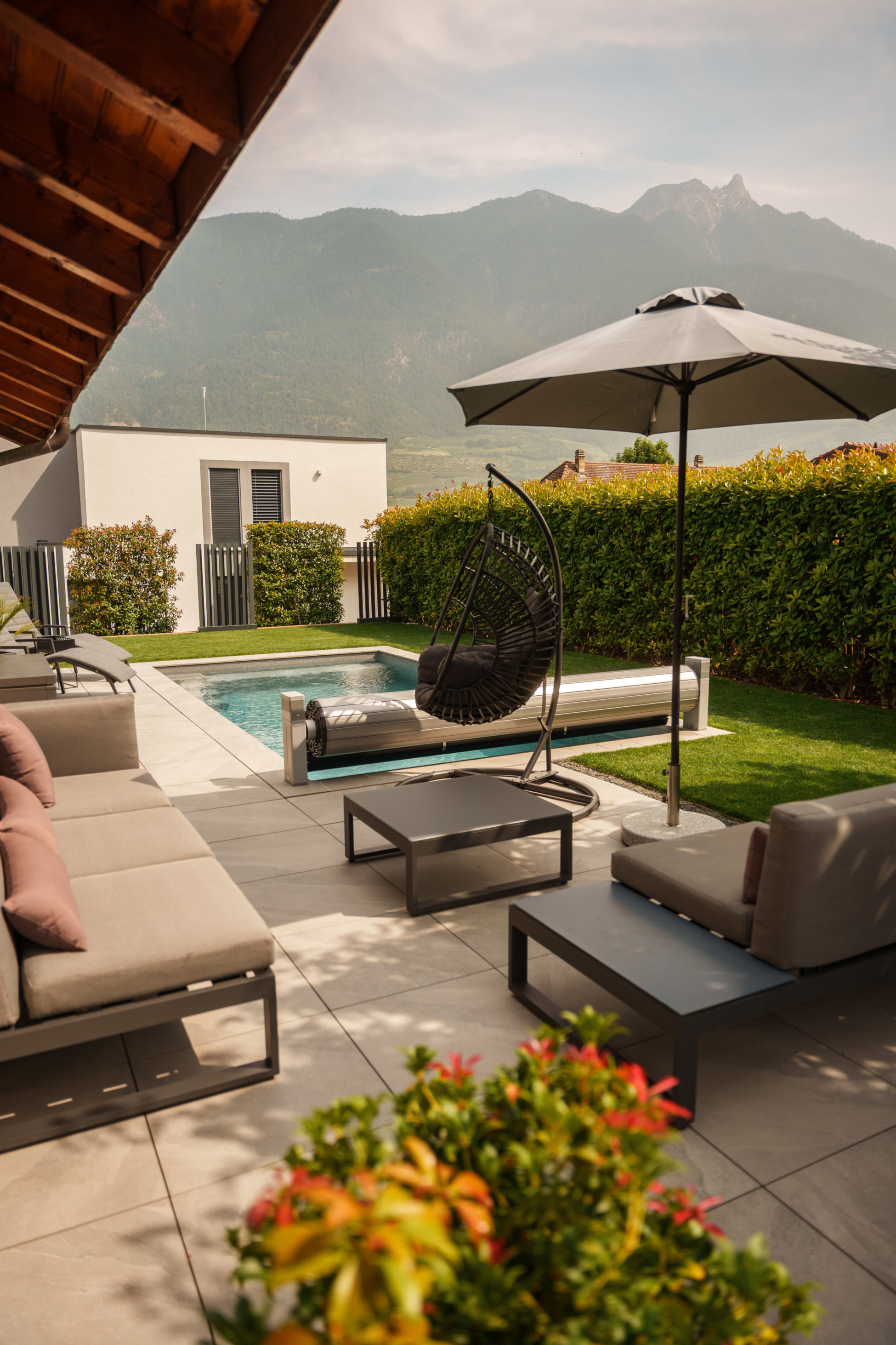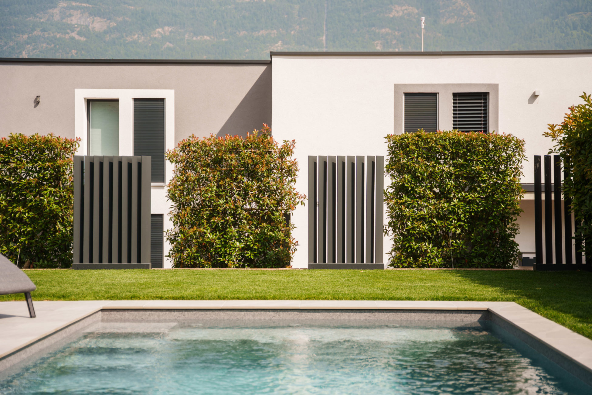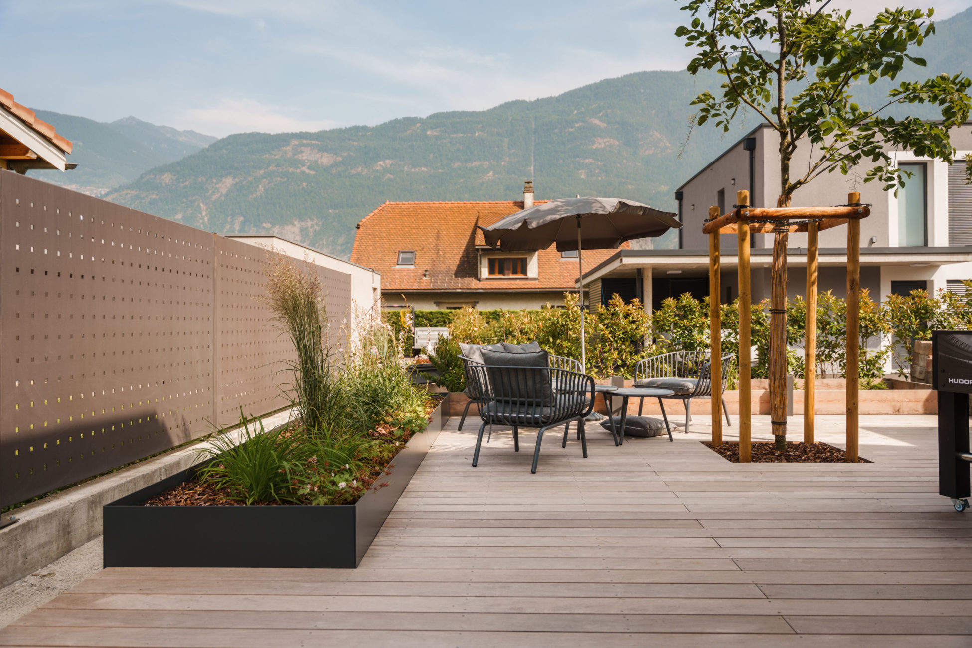 Ce jardin a été aménagé avec une conception en deux niveaux pour répondre à différents usages. Le niveau supérieur accueille un espace de vie et de loisirs, pensé pour les moments en famille ou entre amis. On y trouve une terrasse en grès cérame qui relie la piscine aux différentes surfaces de circulation. Celle-ci est accompagnée de palissades en acier et d’arbres palissés qui structurent élégamment l’espace en faisant office de barrière visuel.