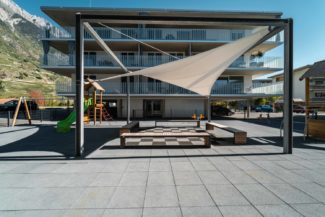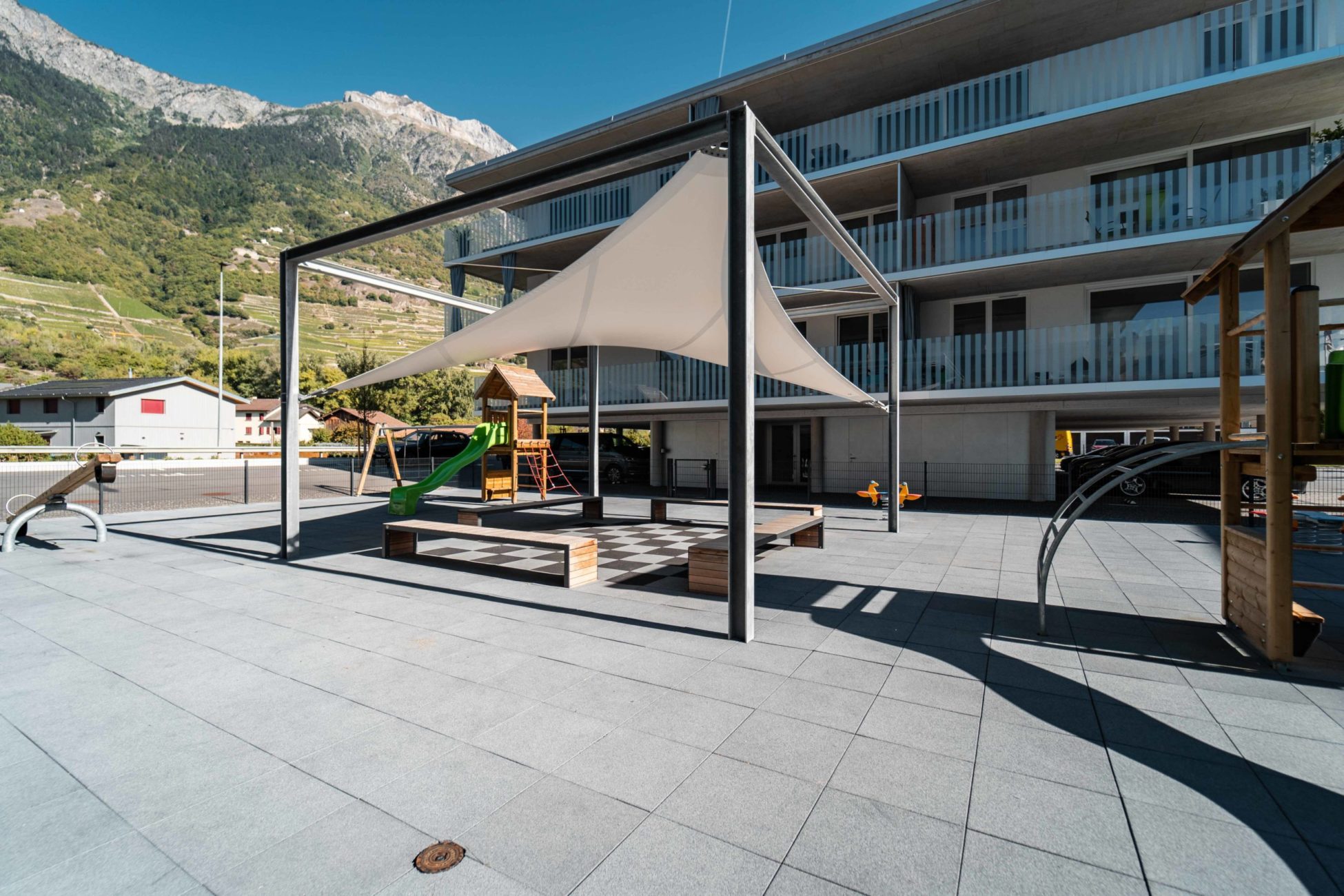 Au centre de la place de jeux extérieure, nous avons alterné les couleurs pour représenter un jeu d'échec. Des bancs ont été installés pour permettre aux parents de surveiller leurs enfants ou de profiter de lire un livre. Grâce à la toile tendue supportant toutes les intempéries, cet espace peut être utilisé en tout temps. Nous avons également été mandatés pour la plantation d'arbres tiges. En collaboration avec l'entreprise de génie civil, nous avons créé des fosses de plantation pour planter des charmes et des érables privilégiés pour leurs critères indigènes. Enfin, pour délimiter l'ensemble de la parcelle, nous avons installé un treillis simple torsion anthracite.