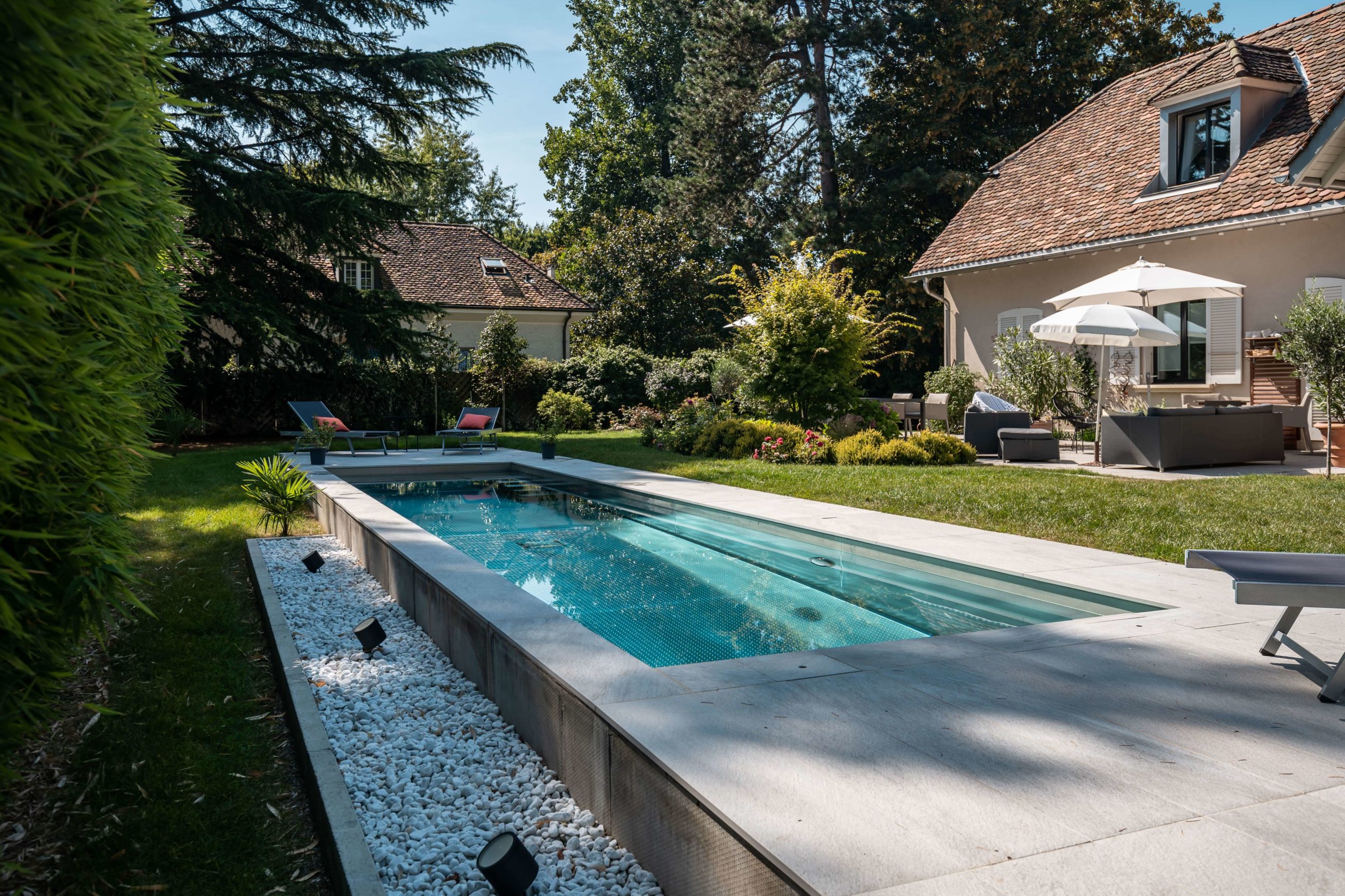 Ce bassin en inox surprend par sa taille trompeuse. En effet, il donne une impression de longueur accrue malgré ses dimensions de 10 x 2,3 m. Il a été livré en un seul bloc par la société Fluidra, ce qui facilite son installation. La couverture lames polycarbonates solaires a été judicieusement dissimulée sous une plage immergée pour une esthétique optimale.