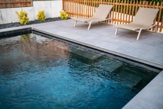 Pour s'intégrer harmonieusement dans son environnement et préserver l'espace vert pour les chiens de la maison, cette piscine a été conçue sous forme carrée de 5x5 mètres. Afin de garantir une esthétique épurée, les 3 skimmers ont été habilement dissimulés derrière la couverture et les trappes d'accès aux feuilles sont en grès cérame.