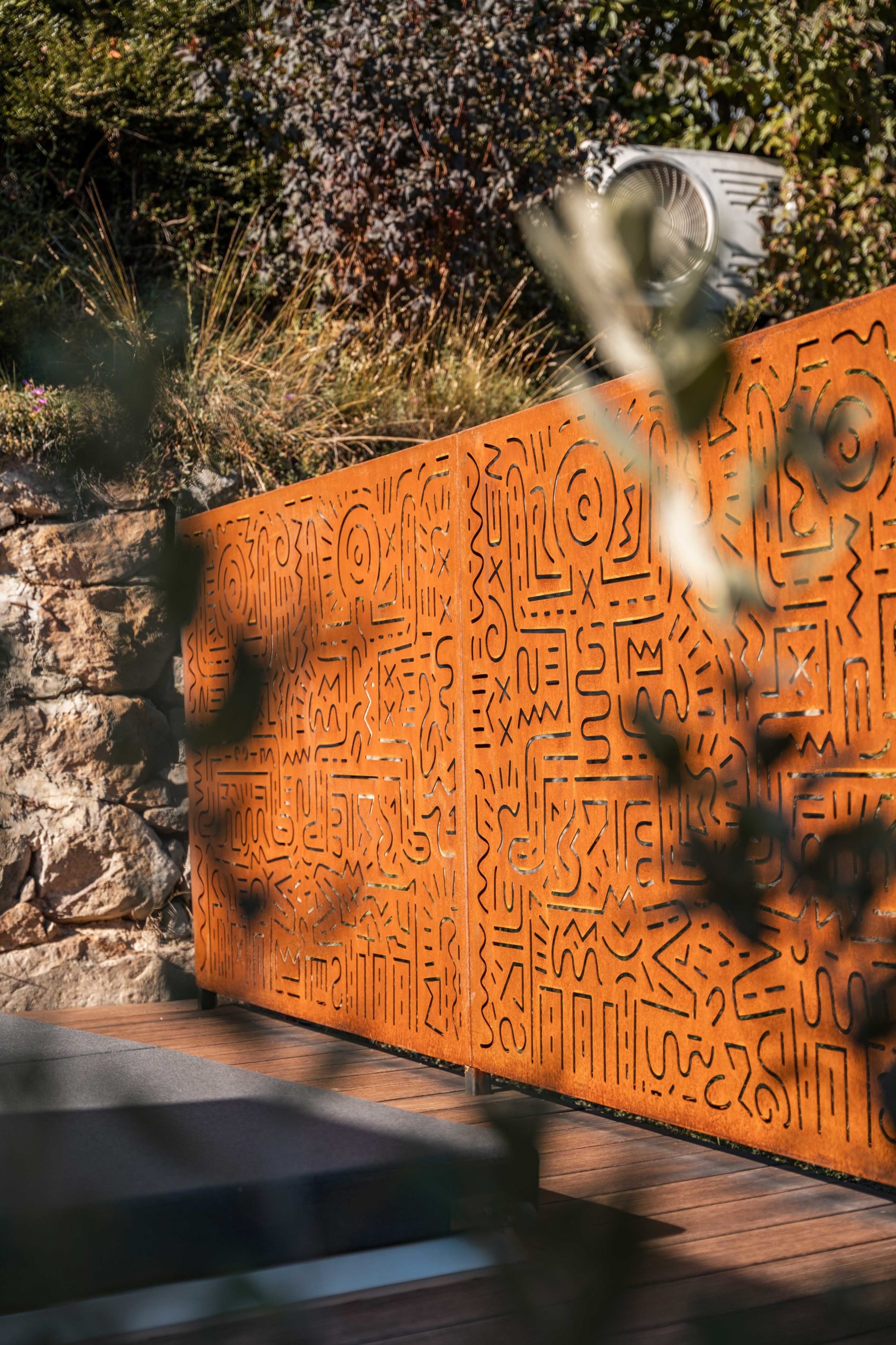 L’arrosage automatique assure un entretien simplifié des surfaces végétalisées. La végétation, mêlant diversité et sobriété, délimite les contours du jardin. Une zone minérale végétalisée à l’arrière de la maison, offre un équilibre subtil entre minéral et végétal.