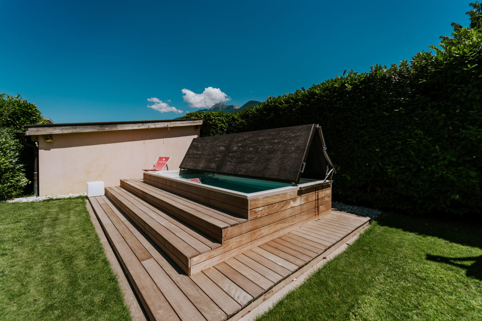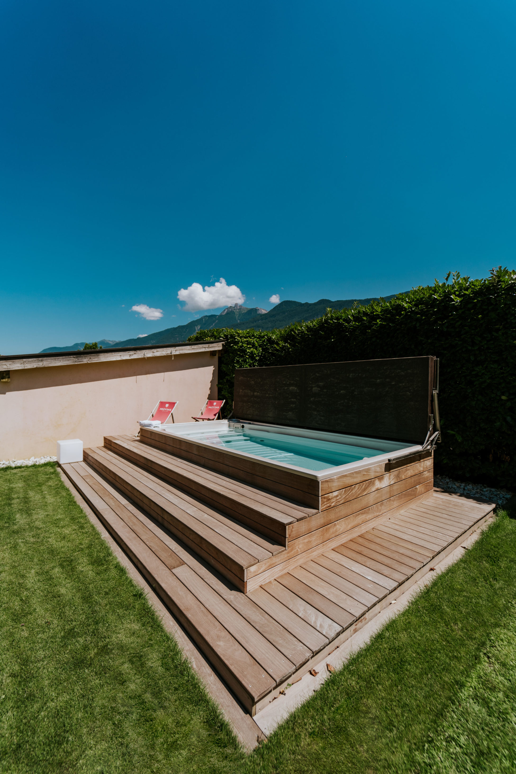 Installé dans le coin d'une pelouse, ce spa de nage a été intégré dans une terrasse avec des marches d'accès en bois. A l'aide du système de lève-couverture mécanique, en peu de temps, le spa est découvert pour accéder à un moment sportif ou de détente.