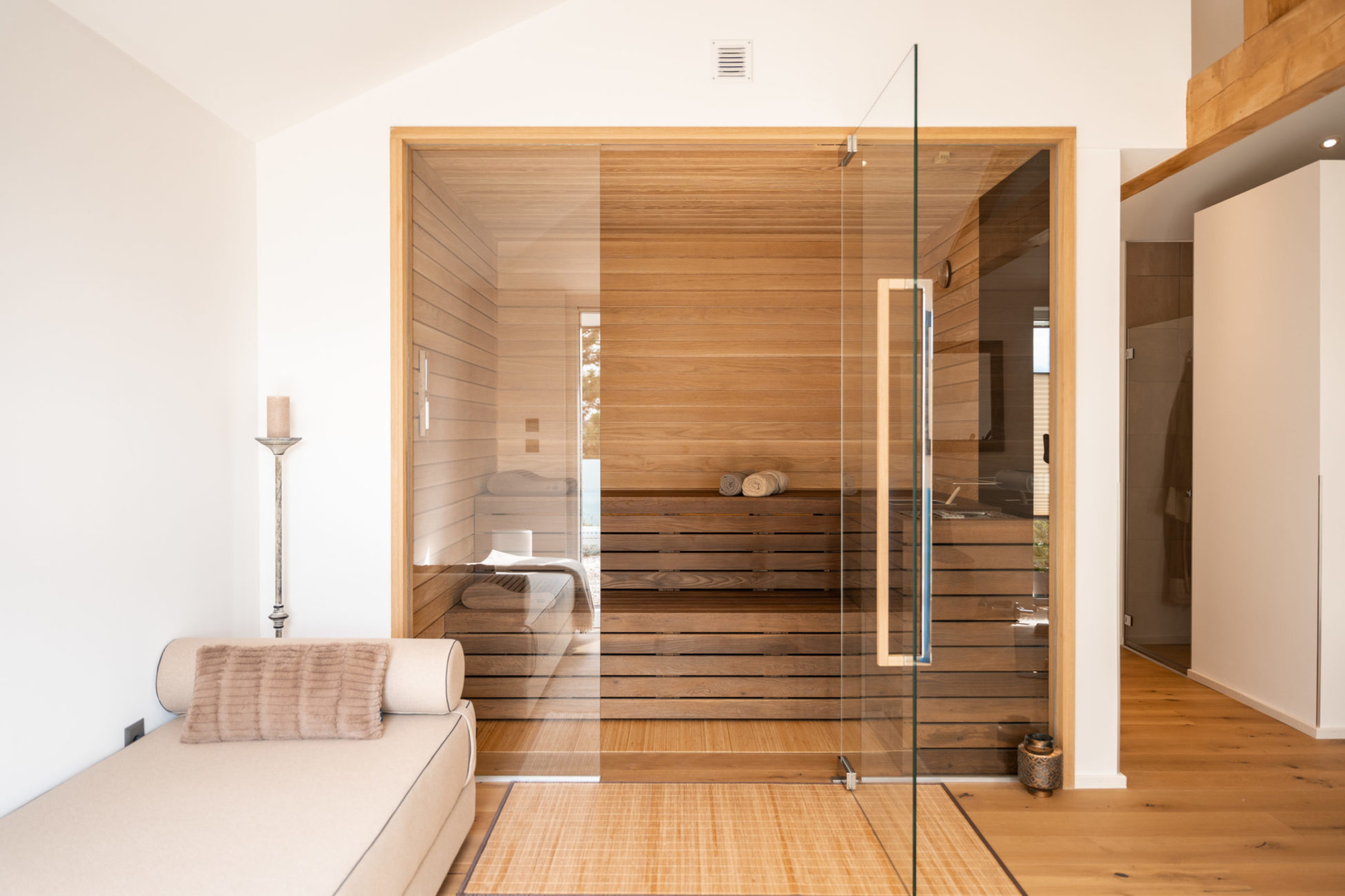 Les éléments de construction sont de très bonne qualité, avec des murs et un plafond exécutés avec des profils en bois de chêne brossé et des banquettes et accessoires en bois de frêne thermo-traité. La paroi au-dessus du poêle est protégée par un verre trempé noir, et le seau d'eau en acier inoxydable est encastré dans le banc et rétroéclairé. La face vitrée est réalisée avec du vitrage trempé de 10mm, légèrement fumé, et la porte est équipée d'un système de pivot avec fermeture automatique et d'une poignée design.